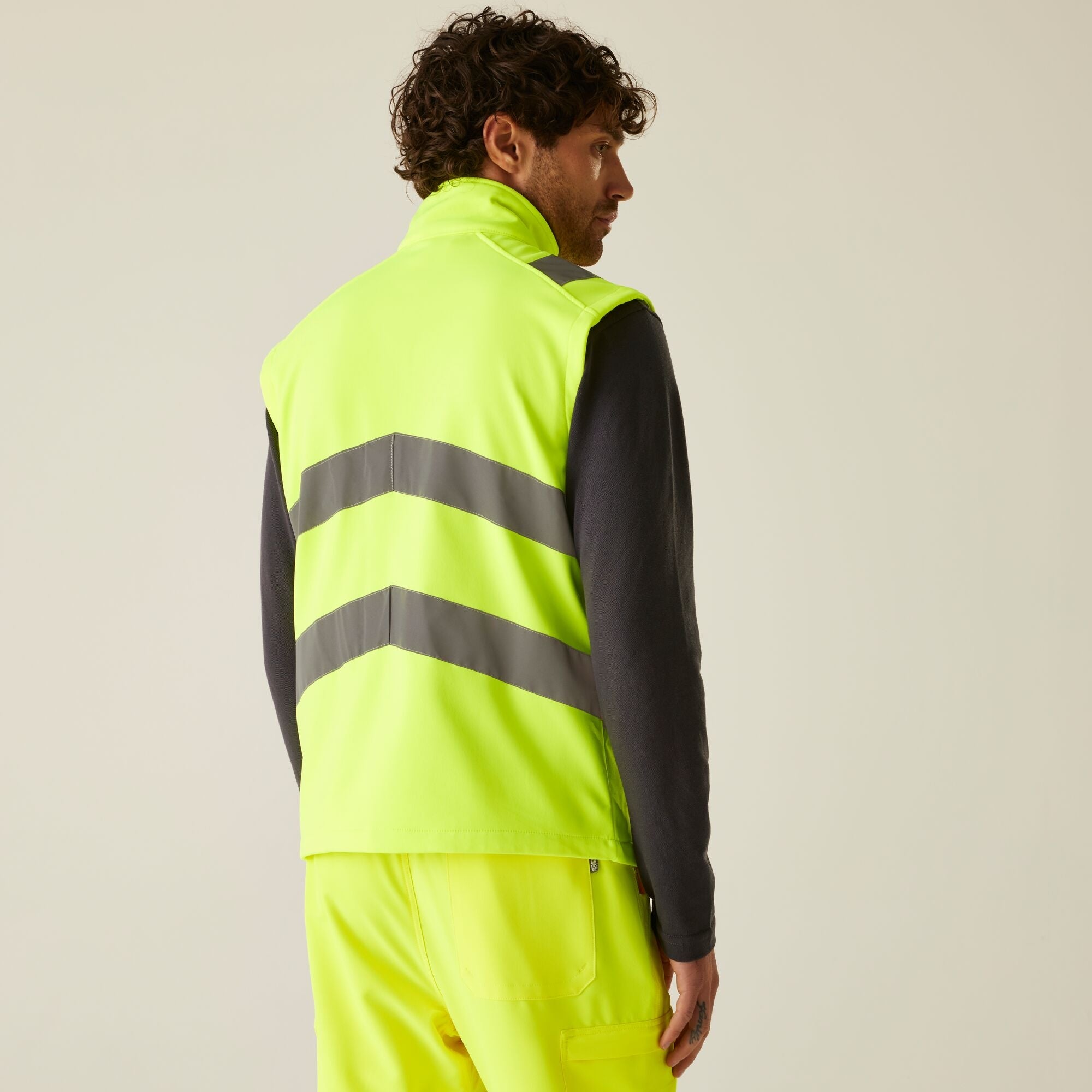 Our men's hi-vis bodywarmer is built for visibility and comfort on the job. Then men's bodywarmer is made from warm-backed, printable softshell fabric and is safety certified. A fleece-lined collar adds warmth, while zipped pockets and a zip guard enhance everyday practicality. It's the perfect softshell bodywarmer for outdoor work.