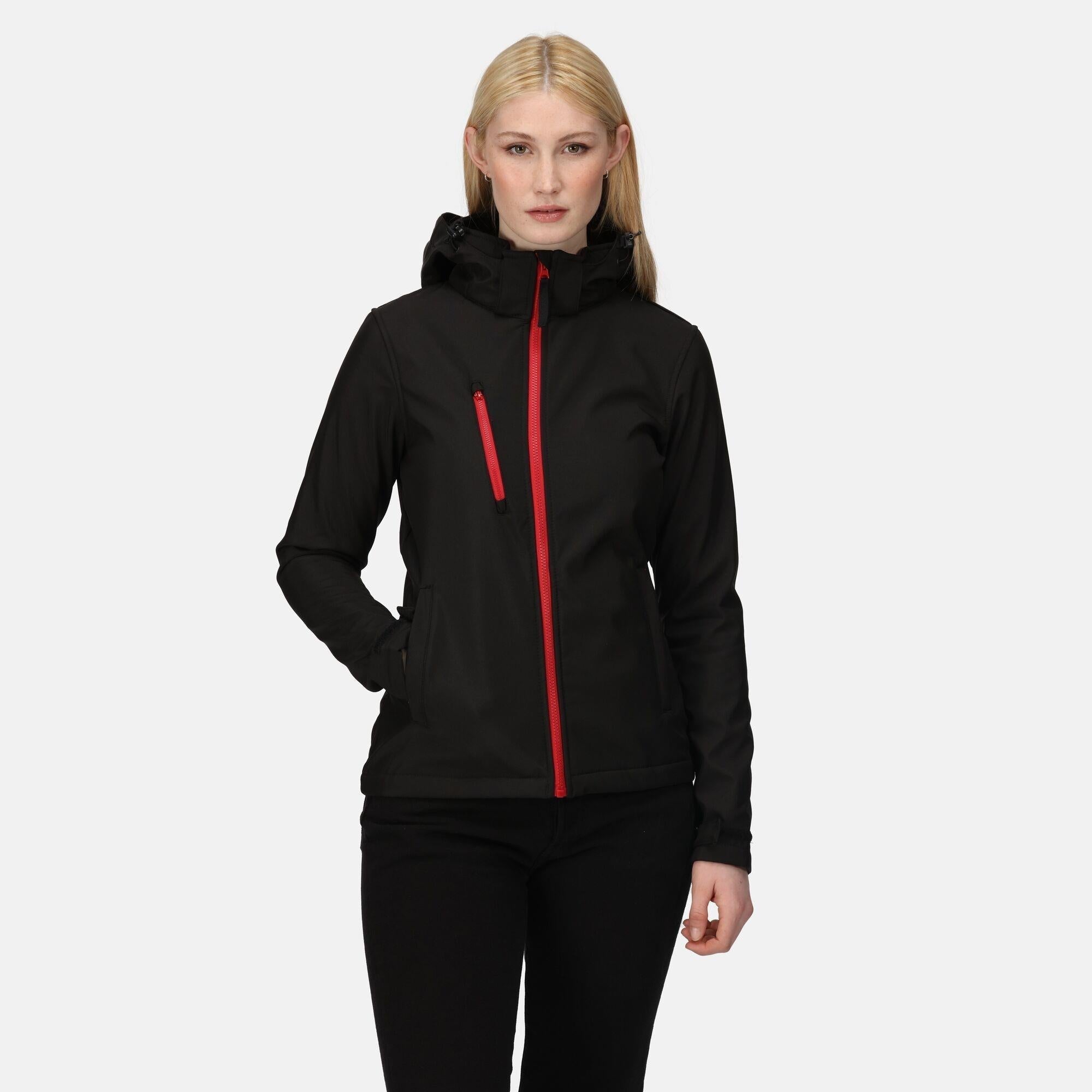 Regatta Venturer black/red women's hooded softshell winter jacket #TRA702