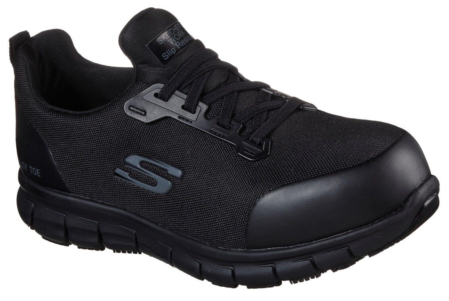 Get right to your day with comfort and safety wearing the Skechers Work Sure Track - Jixie Alloy Toe shoe. This slip-resistant trainer features a slip-on mesh and synthetic upper with electrical hazard and alloy toe protection and stretch-laced front