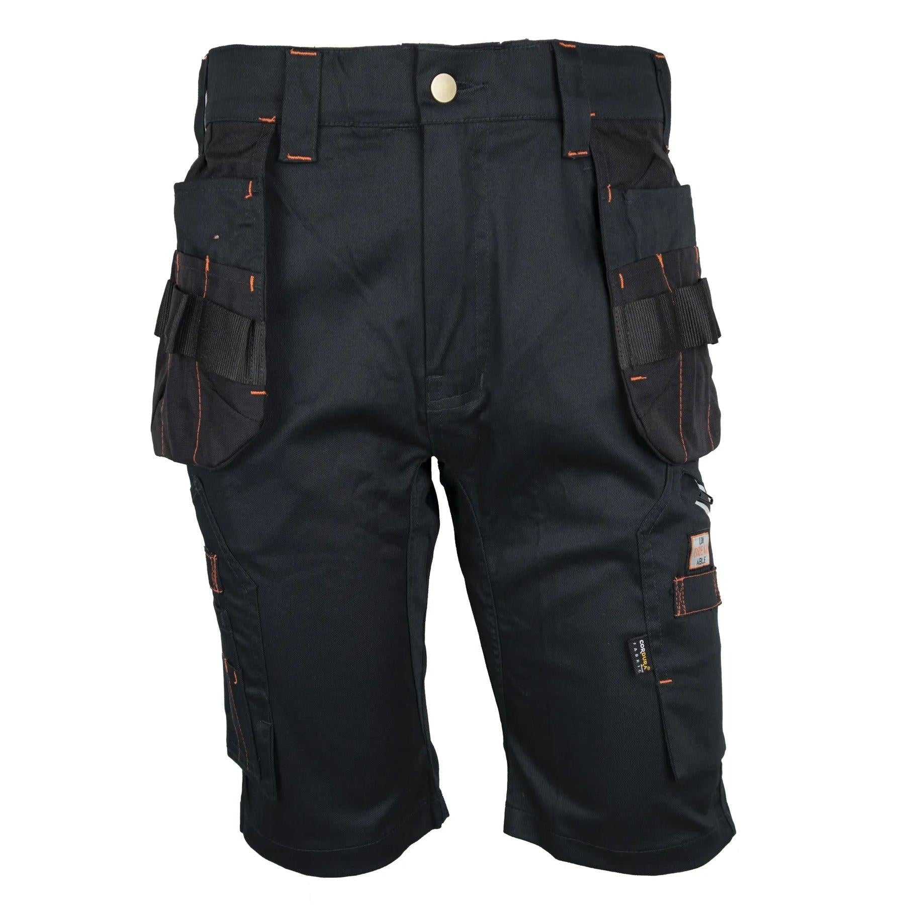 Unbreakable U236 Black Reflex Pro Stretch Work Shorts. Heavy duty. twin holster work shorts. Triple stitched inner seams for added durability and a reinforced waistband. Cordura strengthened combat pockets. Rear pockets and reflective detailing to left combat pocket. Strong YKK zip. Stretch fabric for high comfort.
