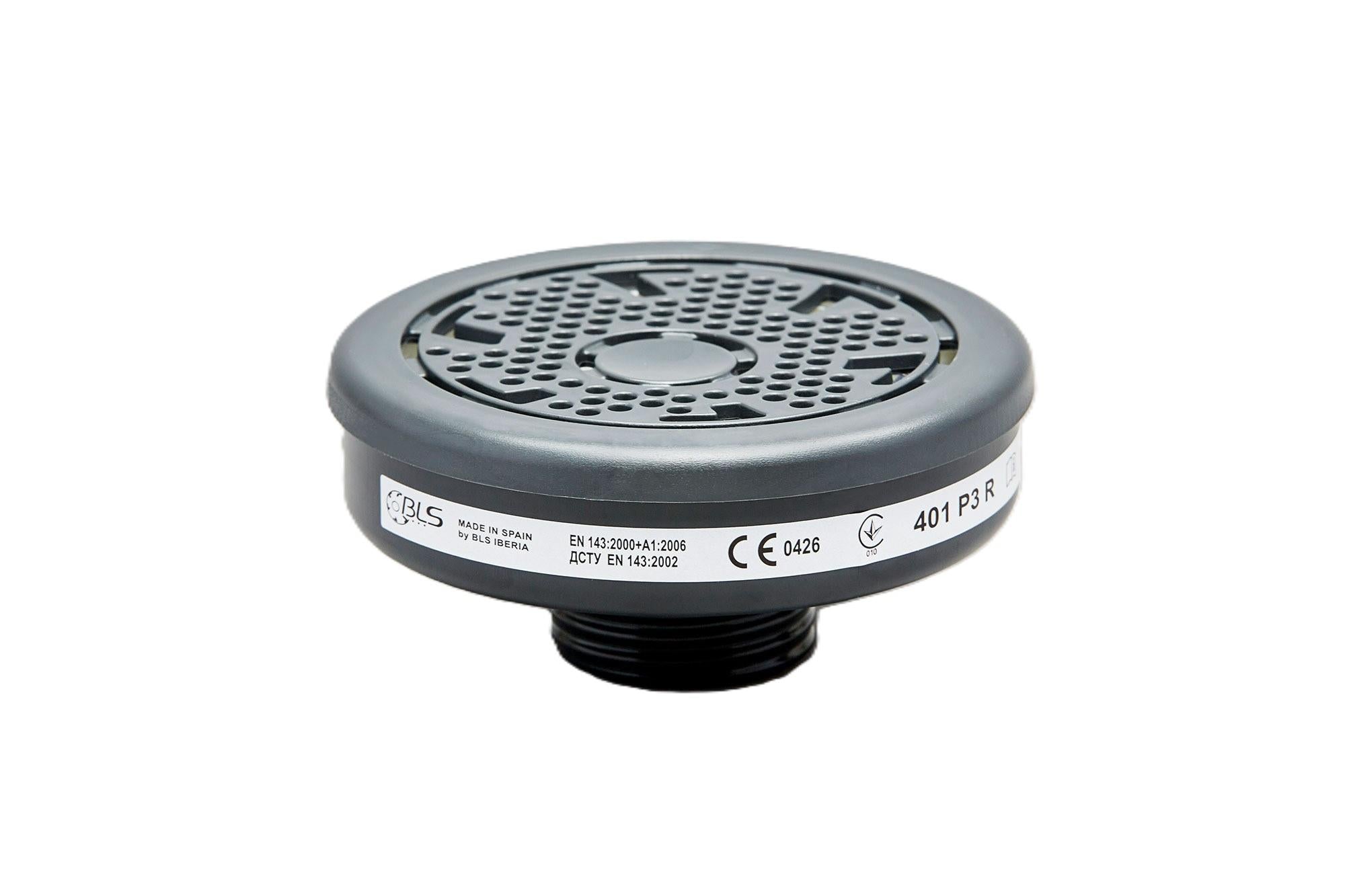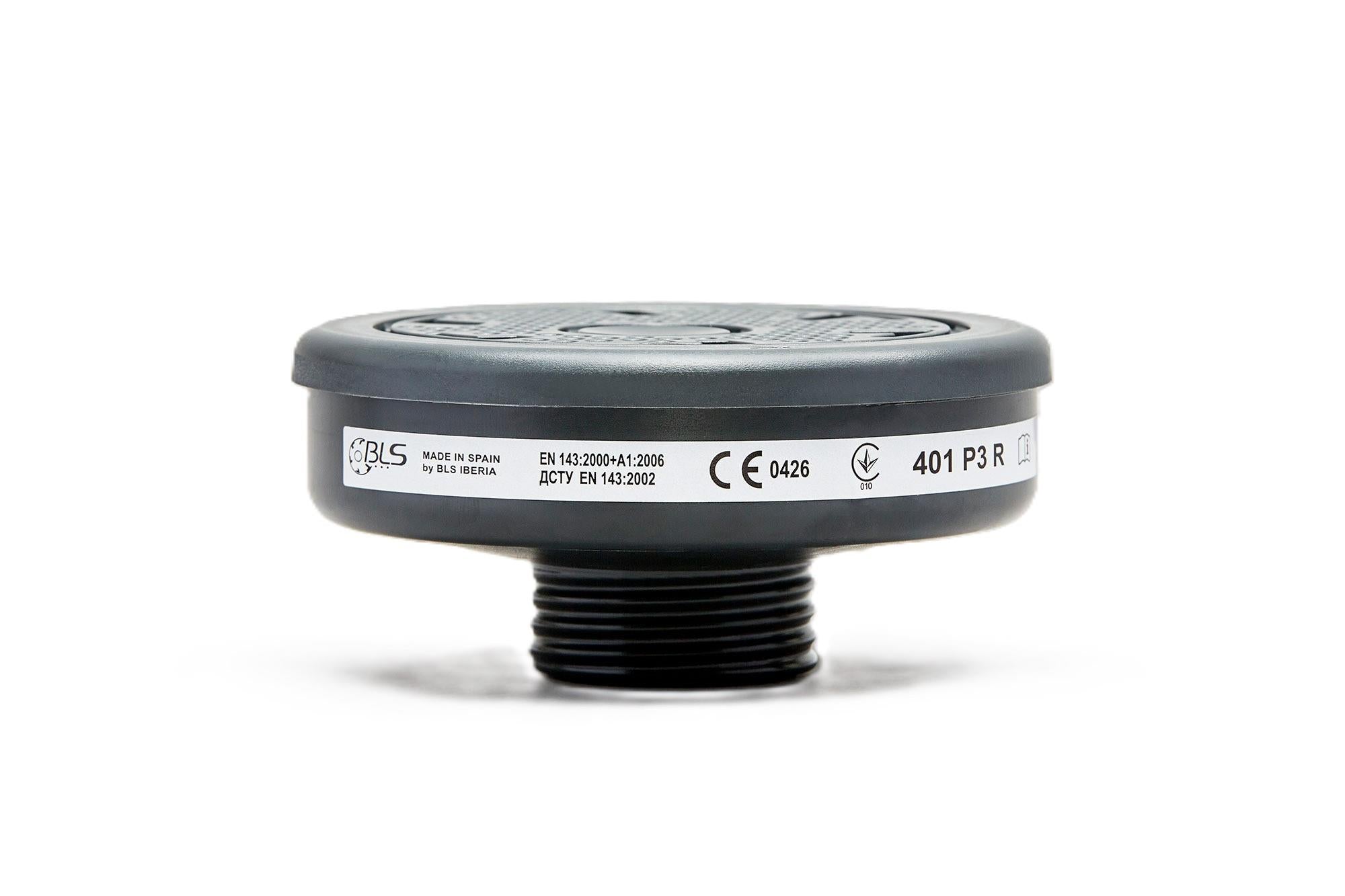 The 401 P3 R filter is a Category III PPE compliant with EN 143: 2000 + A1: 2006 and EN 14387: 2004 + A1: 2008 with universal connection for respiratory protective devices, compatible with BLS SGE46 half masks, full face masks 5000 series (5150, 5400) and 3000 series.
